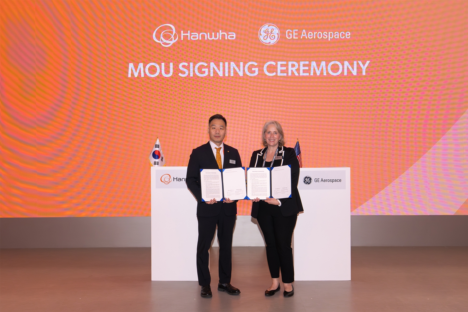 사진1. 20일 일산 킨텍스 ″ADEX 2025″ 전시회에서 김선 한화에어로스페이스 항공사업부장, 리타 플래허티 GE 에어로스페이스 부사장이 함정용 엔진 패키지 공동개발 MOU를 체결하고 기념사진을 찍고 있다..jpg